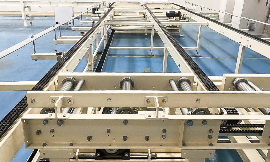 源自于欧系的输送系统,以其重型承载的稳定性著称。承载能力可达100 kg 以上,追踪喷涂时不摇晃,应用于生产线的产品多为格栅、保险杠等大型工件,利用升降机穿梭于多楼层之间。具备稳定、结构简单、速度可调、模块化设计等优点。且各区独立性高,可于在线实施维修工作,不影响其他区域运行。鍊条与传动结构因应各工艺区域采取不同配置,为我司研发重点机种。